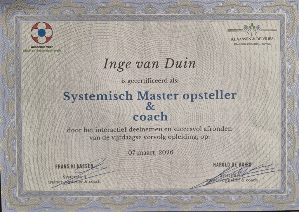 Na 5 intensieve dagen ontving ik het certificaat voor Systemisch Master opsteller & coach.